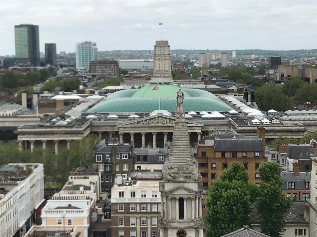 Directly ahead, a collage of iconic structures unfolds. The unusual steeple of St George’s Bloomsbury is silhouetted against the