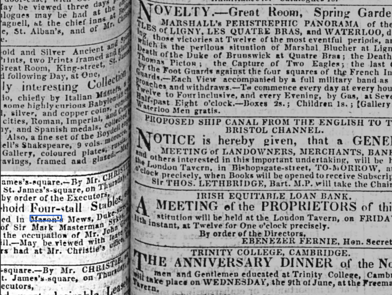 “St. James’s-square, on by order of the Executors, a Freehold Four-stall Stow’ ed in Mason’s Mews, of Sir Mark Masterman. The executors …most desireable or a long term of years…. Premises are substantial.”
