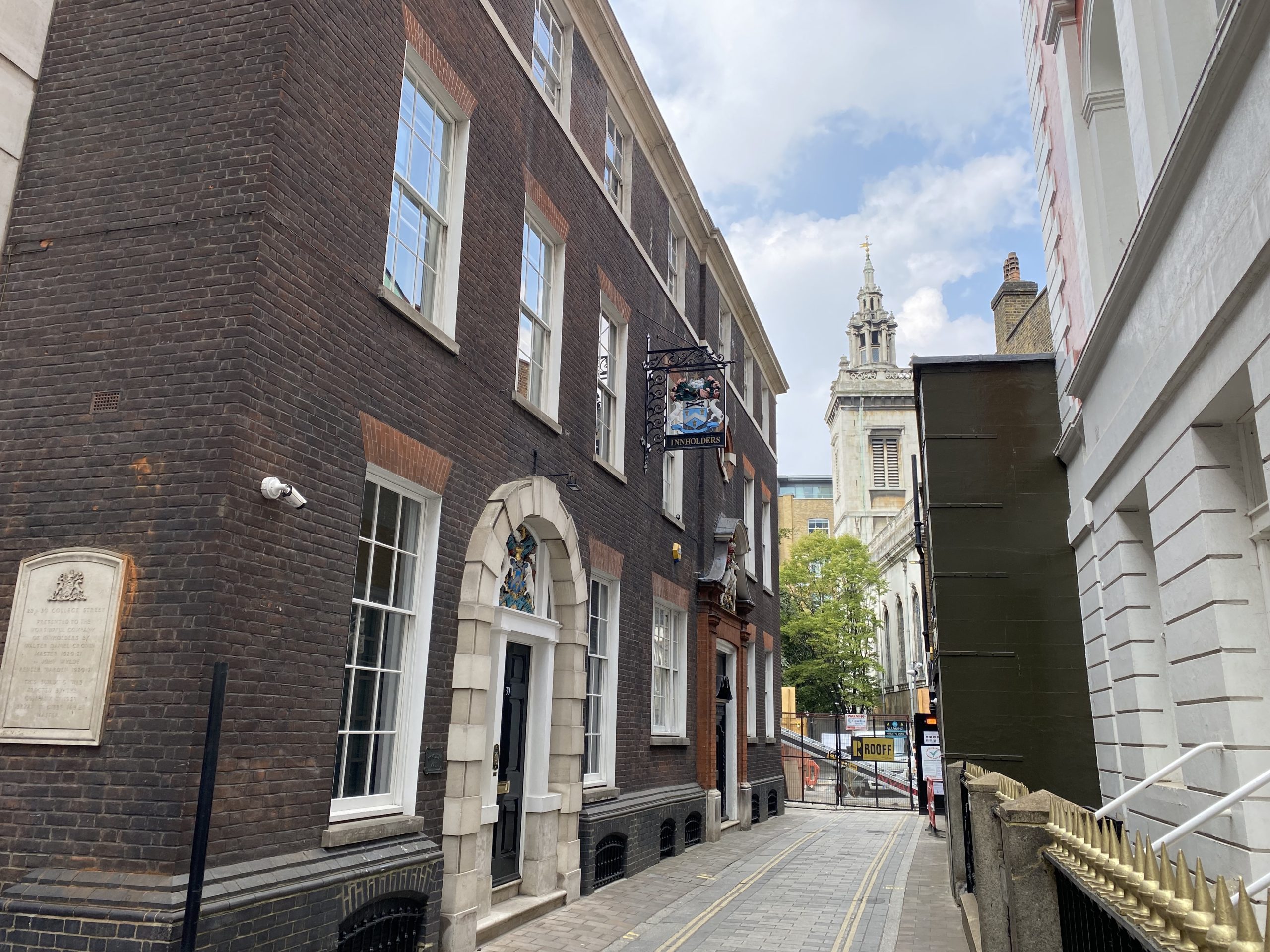 Innholders’ Halll was largely rebuilt in the 1950s after bomb damage, but some of the version reconstructed in 1671 after the Great Fire survives on the inside. On the modern facade towards the street is a handsome seventeenth century door, sitting in a Victorian doorcase with a coat of arms made as a copy of the original.