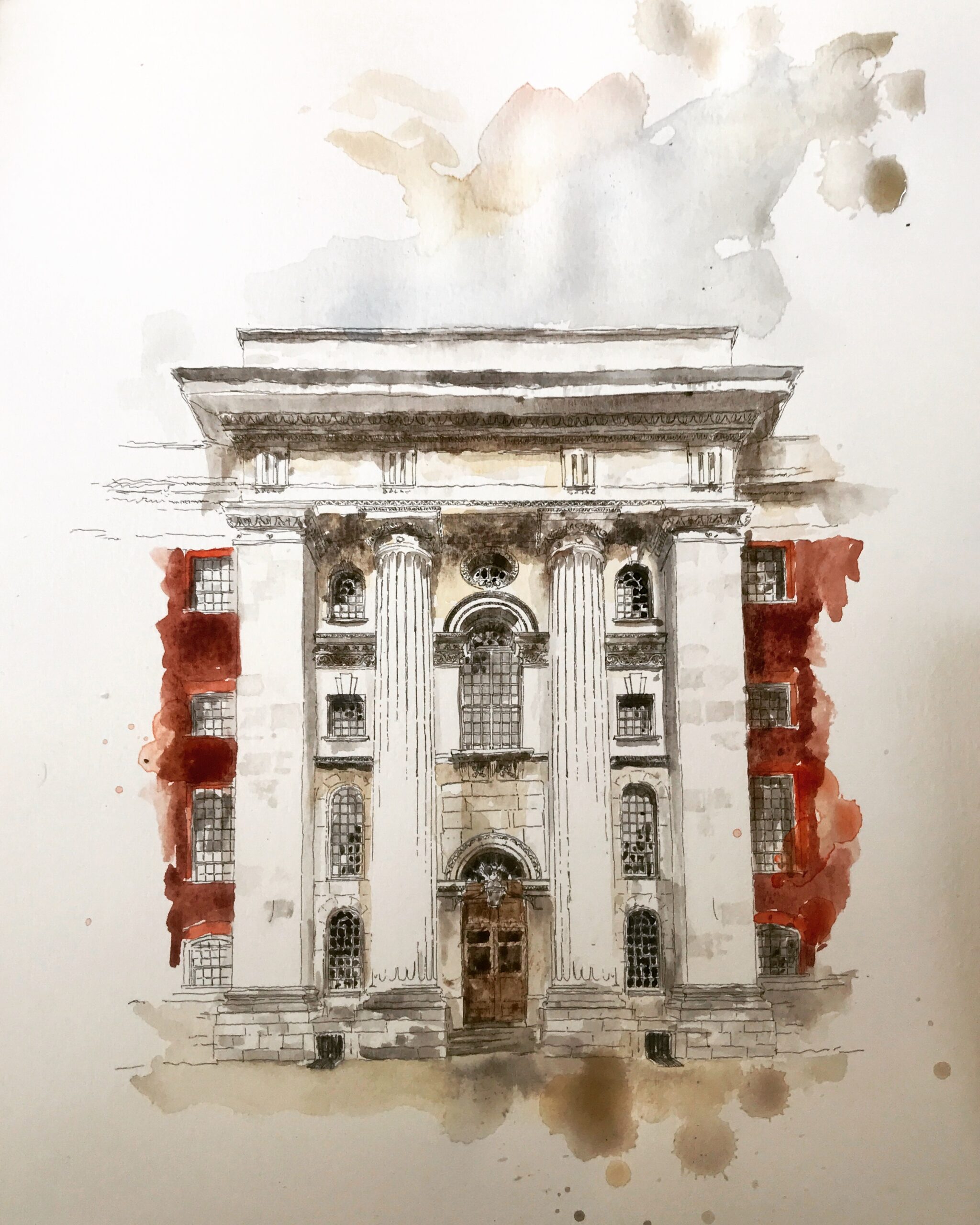 Christian: Sometimes it’s just from me walking around. There are some places I go, and I sometimes go to town halls, et cetera, but others, such as Woolwich Town Hall, someone contacts me and says “would you paint it for me?” And it’s amazing just how 99% of people ask me to paint really interesting buildings. And they asked me to paint and looking at it and go, ‘wow, that’s just beautiful’. And the colours, you know, the pinks, baby blues, just very beautiful and not what you’d expect from a very serious kind of civic building, which where you would expect to be, hard granite to give the power of the state, but it’s actually quite genteel, slightly under scaled and just a lovely space to be in.