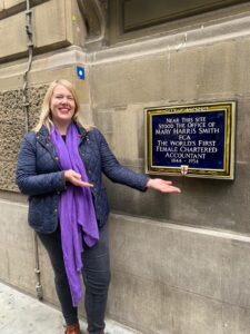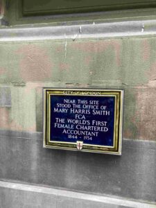 - The plaque, installed on the side of 1 Queen Victoria Street at Bucklersbury, reads that near this site stood the office of “Mary Harris Smith FCA, the world’s first female chartered accountant, 1844–1934.”