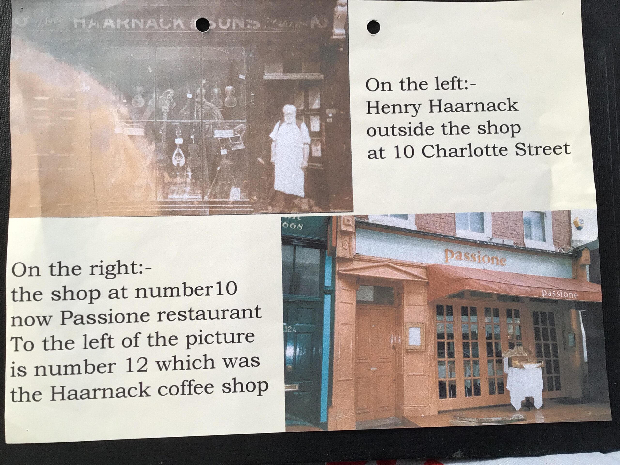 And over the door, it said Passy only, but more importantly, it said number 10 and it was Charlotte St. So I rattled through my photographs that I’d taken the week before when I was in London. And I thought that’s my grandfather’s shop. What a coincidence.