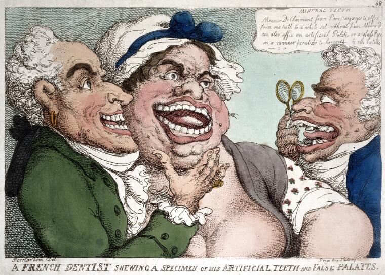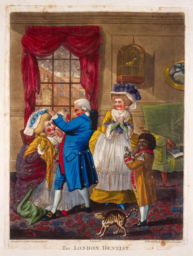 A London dentist extracting a tooth from a woman’s mouth; her female companion and the dentist’s black servant-boy are present. Credit: Public Domain Mark. Coloured mezzotint after Robert Dighton, ca. 1784. Wellcome Collection.
