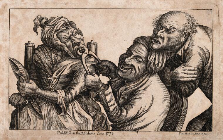A tooth-drawer using pincers to extract a tooth from an old woman, her husband agonisingly observes the situation. Etching by J. Collier after himself, 1773. Wellcome Collection. Public Domain Mark