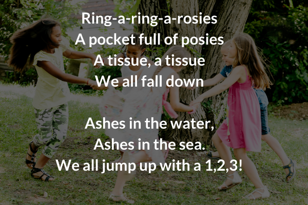 And as the words go Ring a Ring o’ Roses a pocket full of posies. I’ve read some sort of reviews that say, they think this is linked to the black death in 1347. But I actually think I think I agree with the others that say it’s actually the great plague of London in 1665. So the bubonic plague. Because, I mean, it sounds disgusting, doesn’t it? It sounds like such a sweet little rhyme. Apparently the rashes that were experienced with the bubonic plague, they looked like rings and they were quite a rosy colour. And then people stuffed posies into their pockets so they couldn’t smell the dead bodies lying around and piling up.
