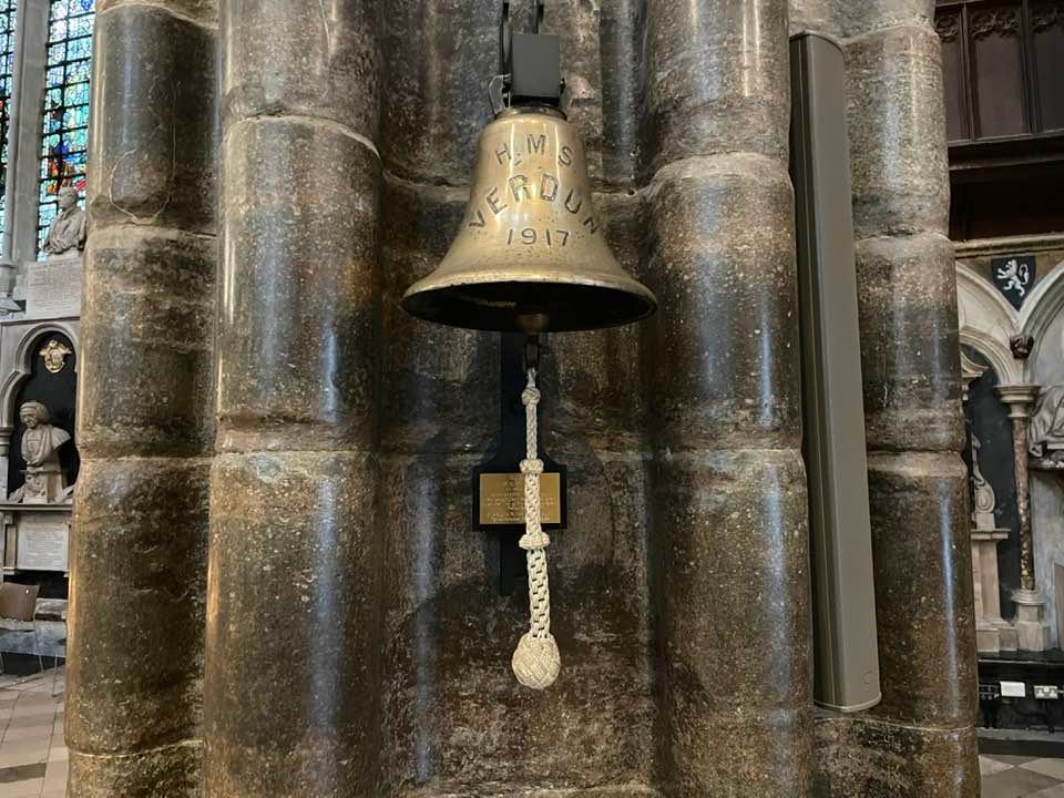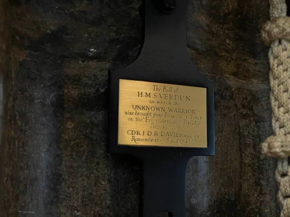 HMS Verdun, the British destroyer, took the unknown warrior from Boulogne. Six destroyers of the Royal Navy Atlantic Fleet provided an honorary naval escort. A 19-gun salute was fired from Dover Castle when they arrived at Admiral Pier, Dover. HMS Verdun’s bell was presented to the Abbey and now hangs on a wall near to the grave of the unknown warrior.