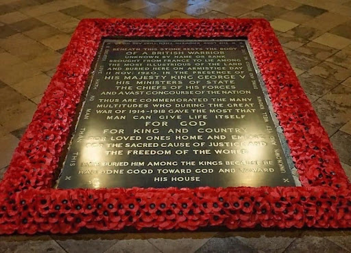 When visiting Westminster Abbey or watching one of the filmed ceremonies you may notice a black marble stone (7x 4 ft) set in the floor which everyone walks around, including the monarch. That is the grave of the Unknown Warrior, a symbol of all the glorious dead from World War I (1914-1918).